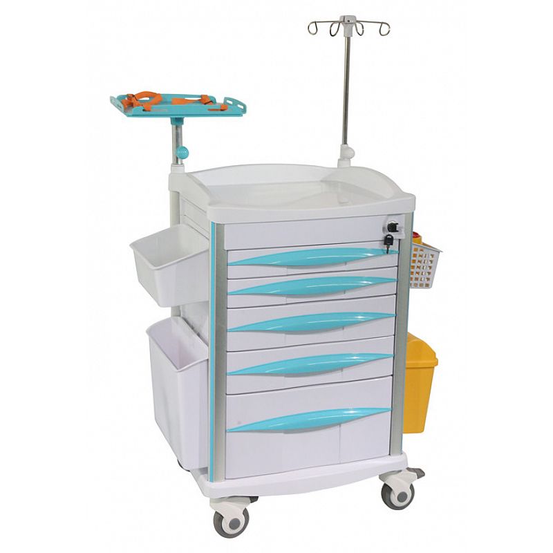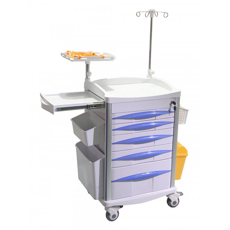 5.右:带有隐藏的可调节高度的IV杆,篮中有2个尖锐的盒子,2个垃圾桶