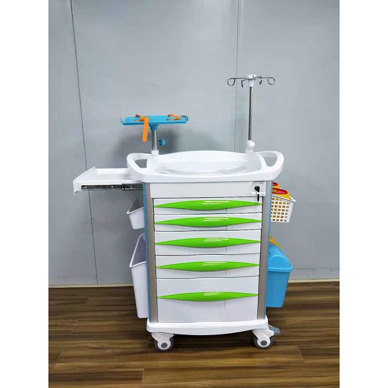 5.右:带有隐藏的可调节高度的IV杆,篮中有2个尖锐的盒子,2个垃圾桶